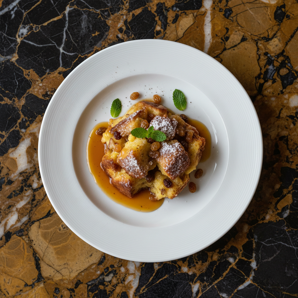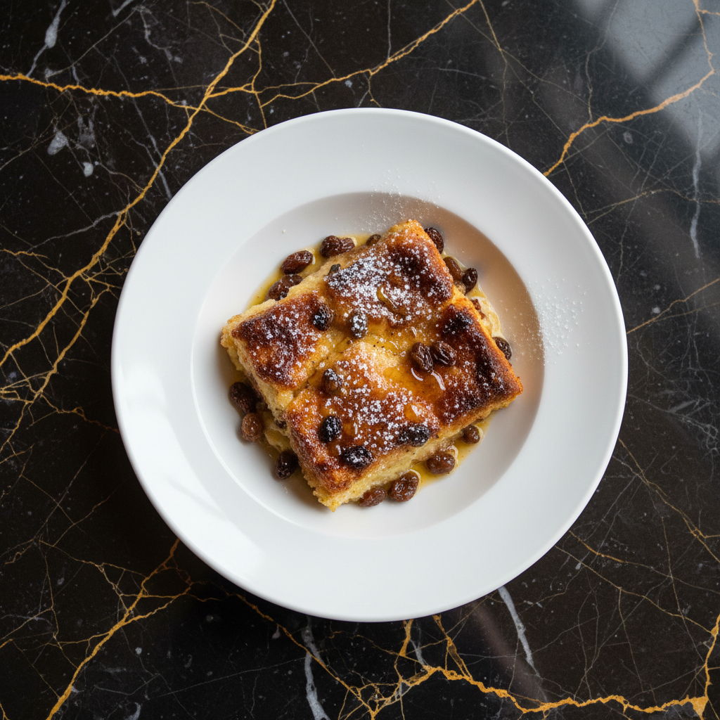 A comforting and simple dessert made from layers of buttered bread, soaked in a rich custard of eggs, milk, and cream, often enhanced with raisins and a hint of Irish whiskey.