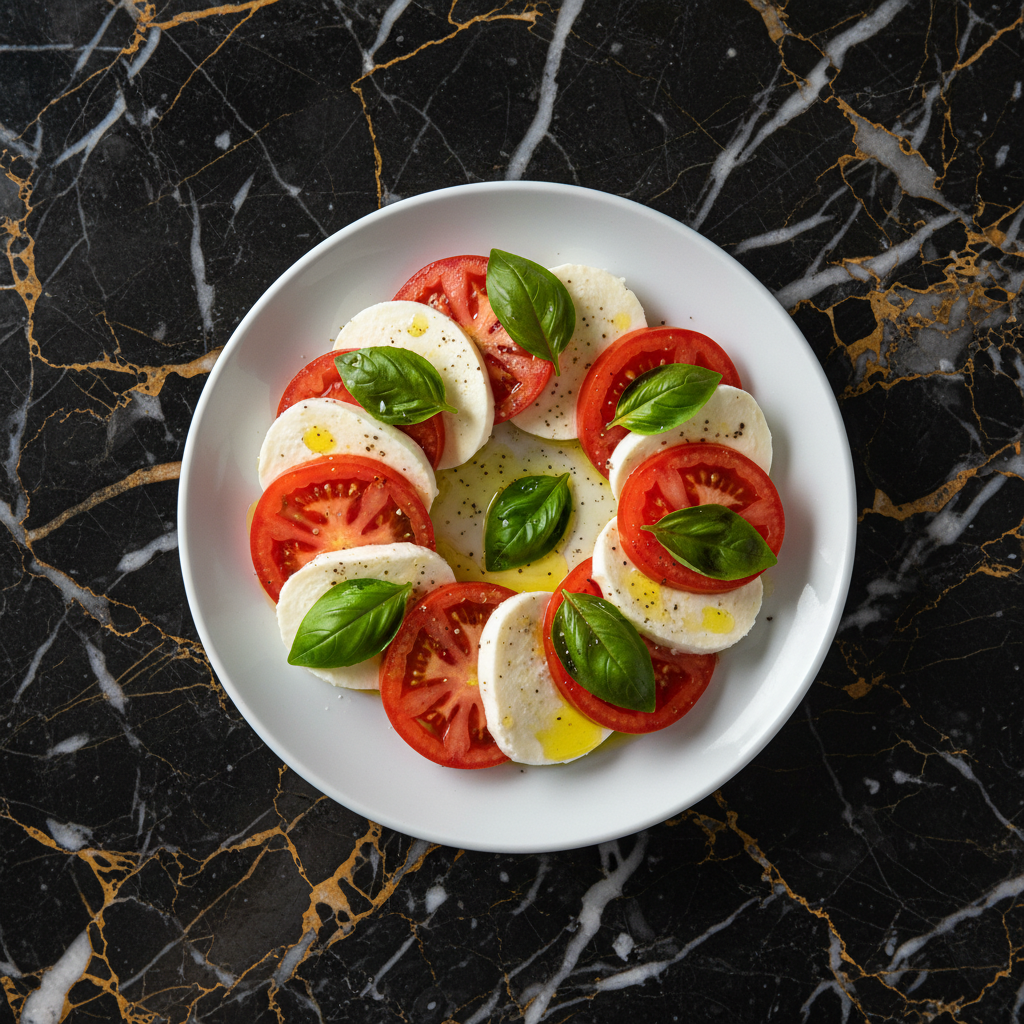 A quintessential Italian summer salad showcasing the vibrant flavors of fresh mozzarella, ripe tomatoes, and aromatic basil, simply dressed with high-quality extra virgin olive oil and sea salt. This dish celebrates the beauty of simple, fresh ingredients.