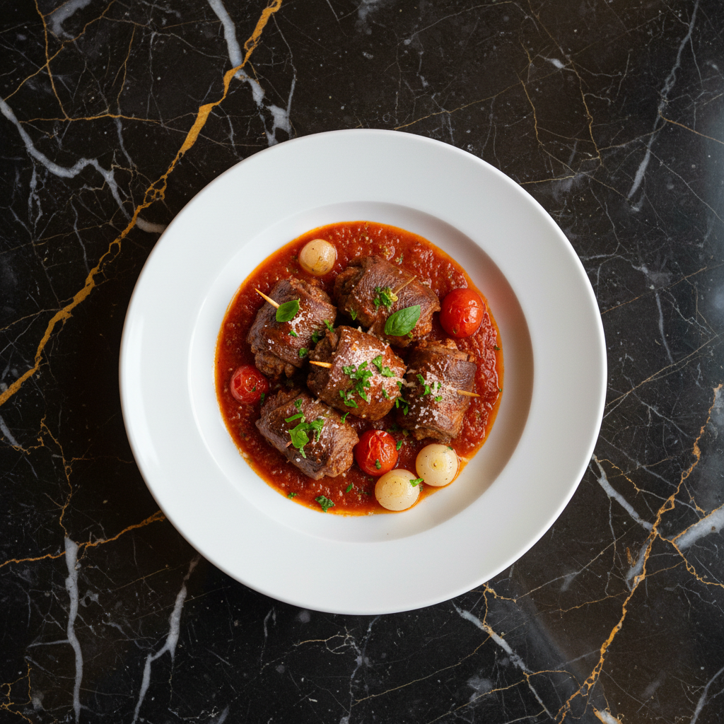 Tender thin slices of beef, rolled around a savory and slightly sweet filling of breadcrumbs, pine nuts, raisins, and Pecorino cheese, then slow-braised in a rich tomato sauce. A classic Sicilian specialty.