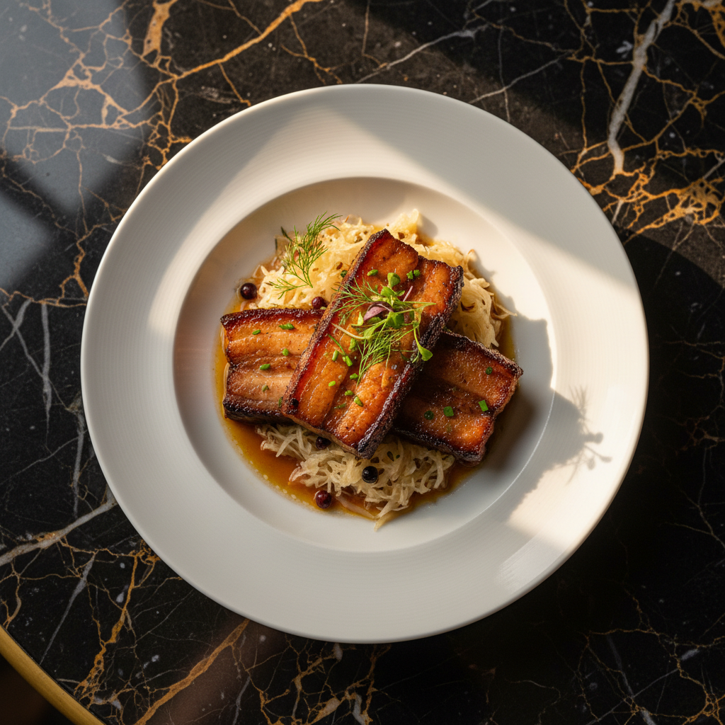 A hearty and flavorful dish featuring tender, juniper-smoked pork belly braised with tangy sauerkraut, creating a complex balance of smoky, savory, and sour notes. This recipe highlights traditional Estonian ingredients and slow-cooking methods.