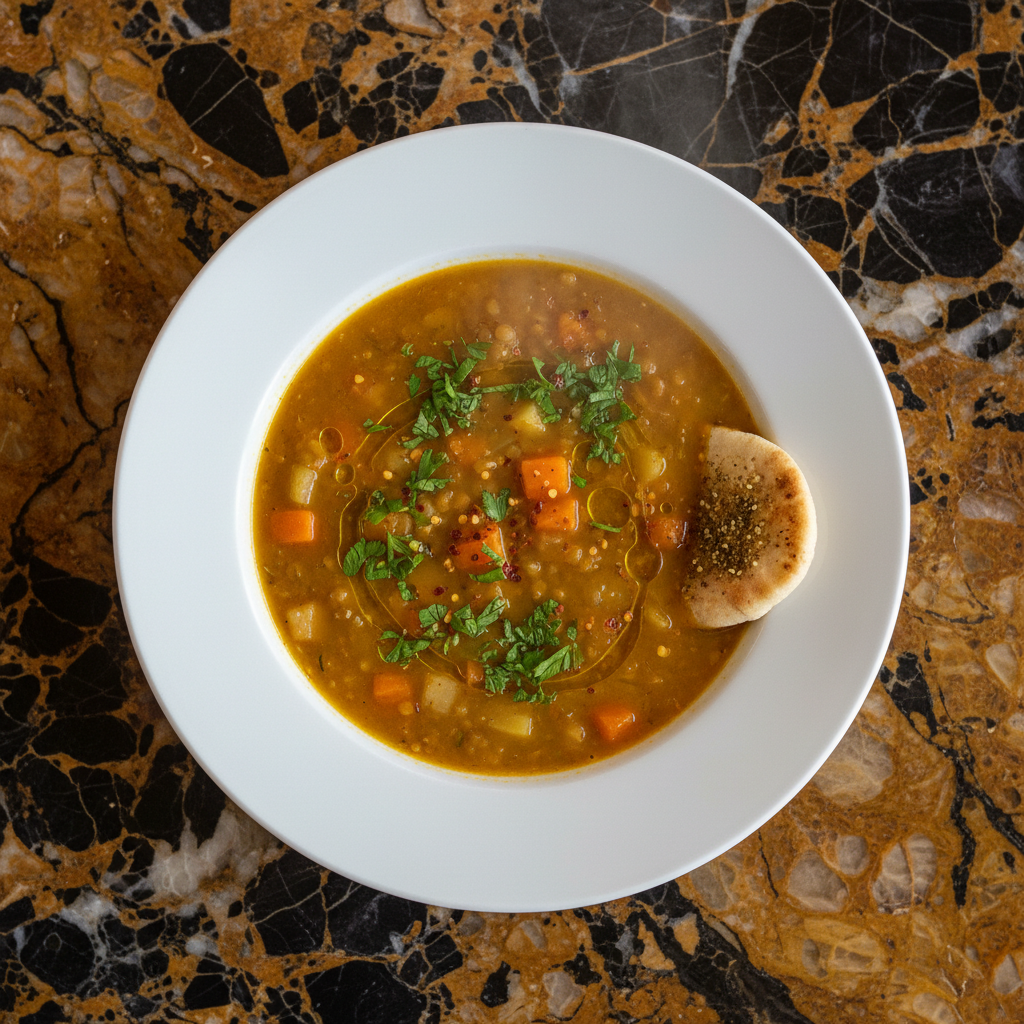 A hearty and comforting soup made with red lentils, vegetables like carrots, celery, and potatoes, and aromatic spices such as cumin, coriander, and turmeric. This soup is a staple in Jordanian cuisine, often enjoyed during colder months or as a light meal.