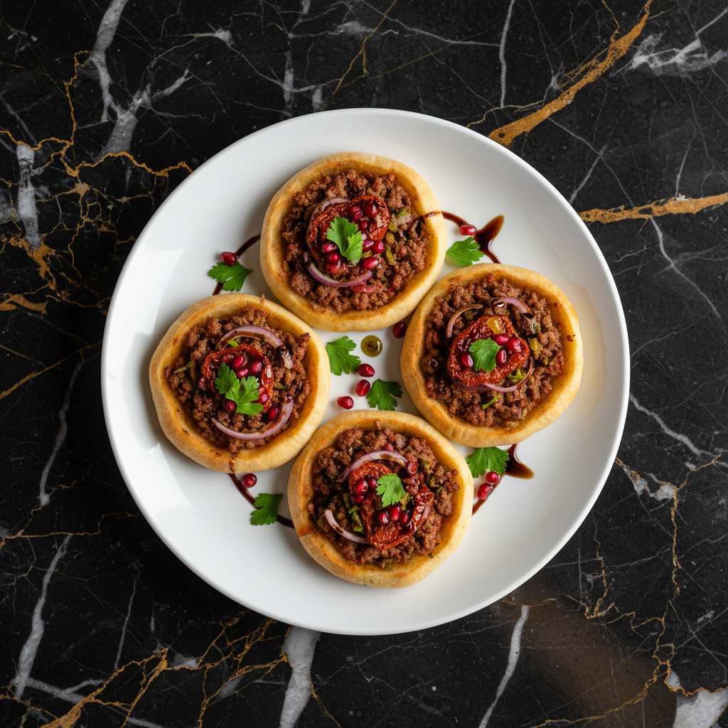 Sfiha are small, open-faced meat pies with a soft dough base, traditionally topped with a spiced mixture of ground lamb or beef, tomatoes, onions, and pomegranate molasses. They are a popular savory snack or appetizer across the Levant.