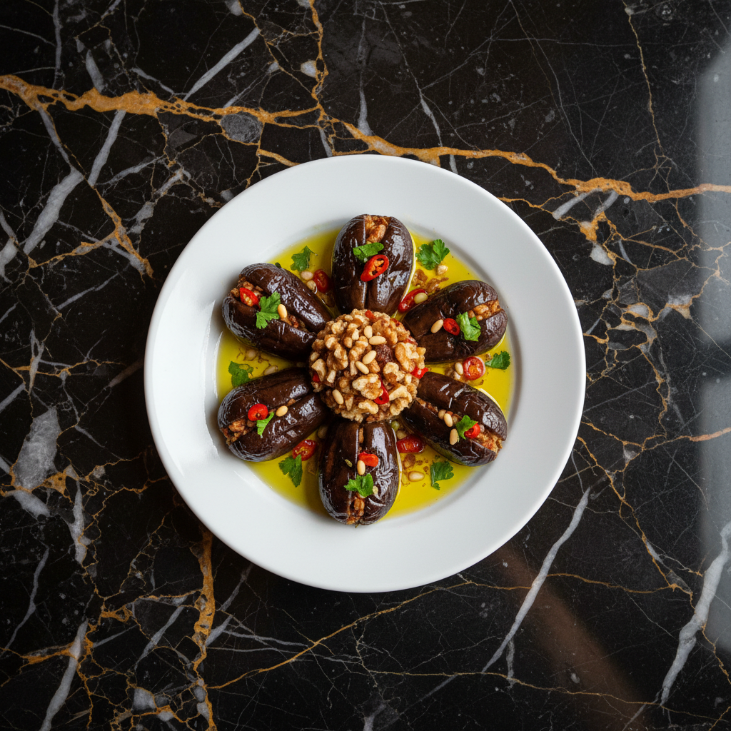 Baby eggplants are blanched, salted, and then stuffed with a flavorful mixture of walnuts, garlic, and chili peppers. They are then preserved in olive oil, creating a tangy, savory delicacy that's a staple in Jordanian mezze.