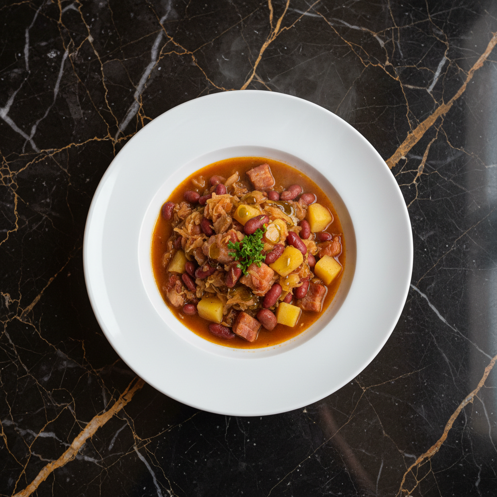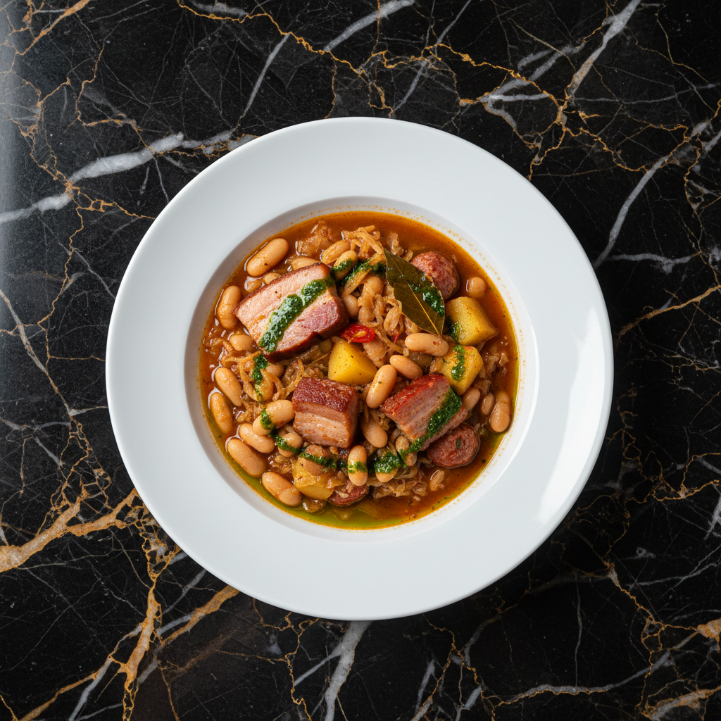 A hearty and comforting Slovenian stew, Jota is a classic Alpine dish featuring tender beans, tangy sauerkraut, soft potatoes, and savory smoked pork. Perfect for a cold day.