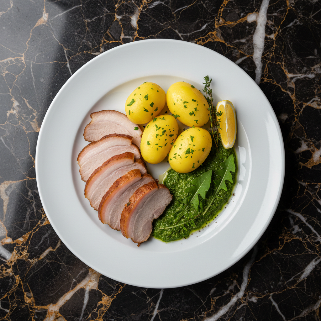 A traditional Luxembourgish dish featuring smoked pork neck (Judd) served with boiled potatoes and a sauce made from dandelion greens (Gรคnsblรฉckcher). It's a hearty and flavorful meal, often considered a national dish.