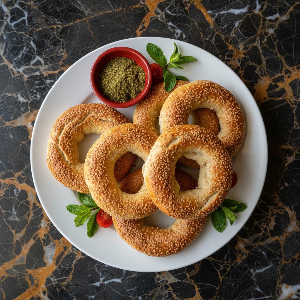 Lebanese Ka'ak are soft, chewy, ring-shaped bread, generously coated in sesame seeds. A quintessential street food, often enjoyed for breakfast or as a snack, perfect with a spread of cheese or za'atar.