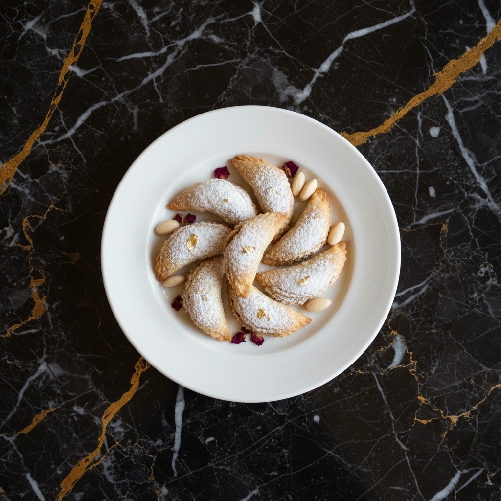 Delicate, crescent-shaped pastries filled with a fragrant almond paste, a classic Moroccan sweet treat often served during celebrations and special occasions. The name translates to 'gazelle horns' due to their distinctive shape.