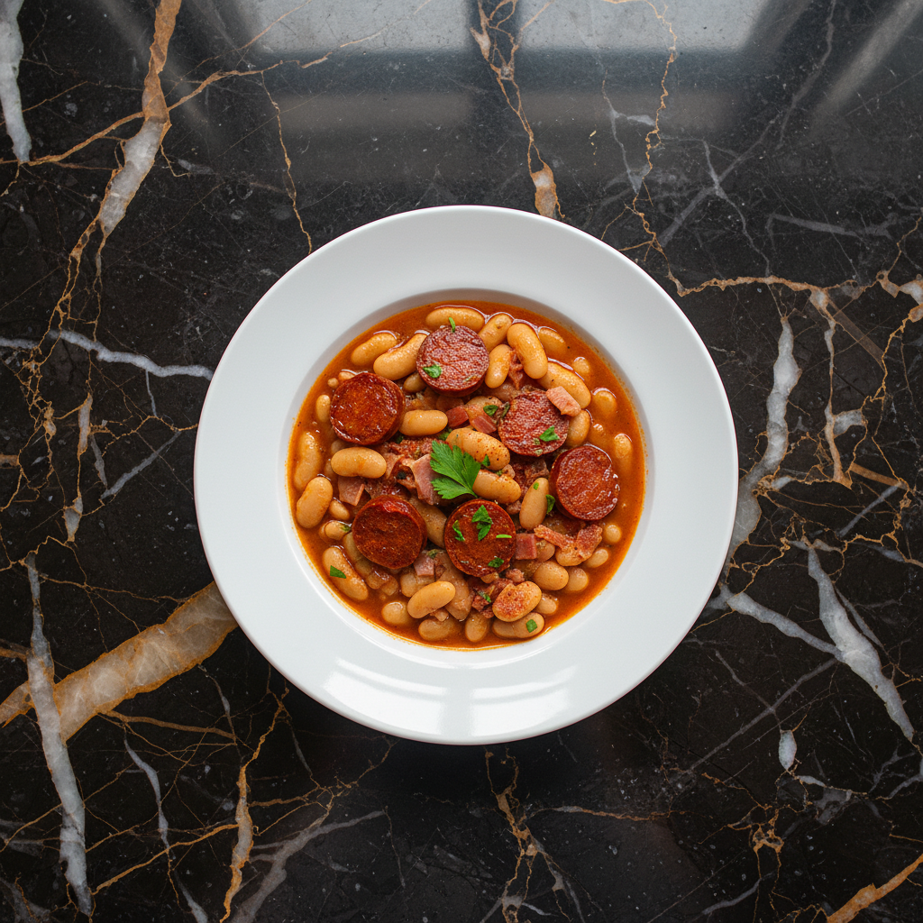 A hearty and comforting Segovian stew featuring massive white beans (judiones) slow-cooked with flavorful chorizo, morcilla, and pork belly. A true taste of mountain comfort.