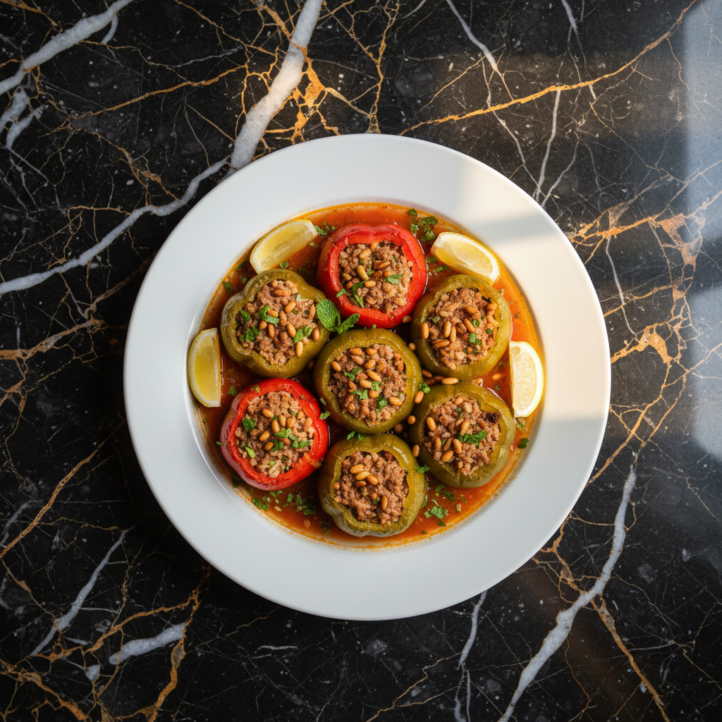 Bell peppers stuffed with a flavorful mixture of rice, ground meat (lamb or beef), onions, and aromatic spices, then simmered in a light tomato broth. This dish is a comforting and classic part of Jordanian cuisine.