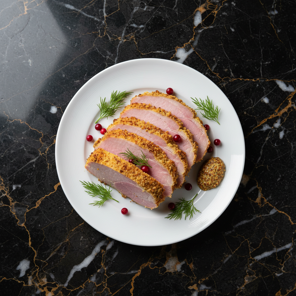 A traditional Swedish Christmas ham, this Julskinka features a succulent, slow-cooked ham coated in a flavorful mustard and breadcrumb crust, baked to golden perfection. It's a stunning centerpiece for any holiday feast.