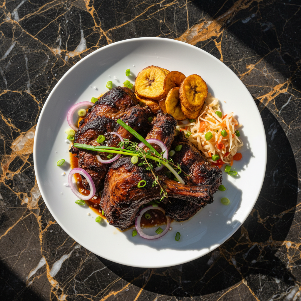 Smoked or grilled goat, a popular dish in Haiti known for its tender texture and smoky, spiced flavor. It's often marinated and slow-cooked or grilled over charcoal.