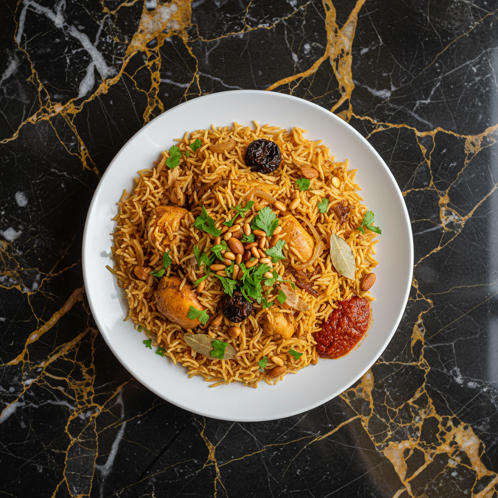 Saudi Arabia's national dish - a fragrant and flavorful rice dish typically made with chicken or lamb, infused with aromatic baharat spices, tomatoes, and dried limes.