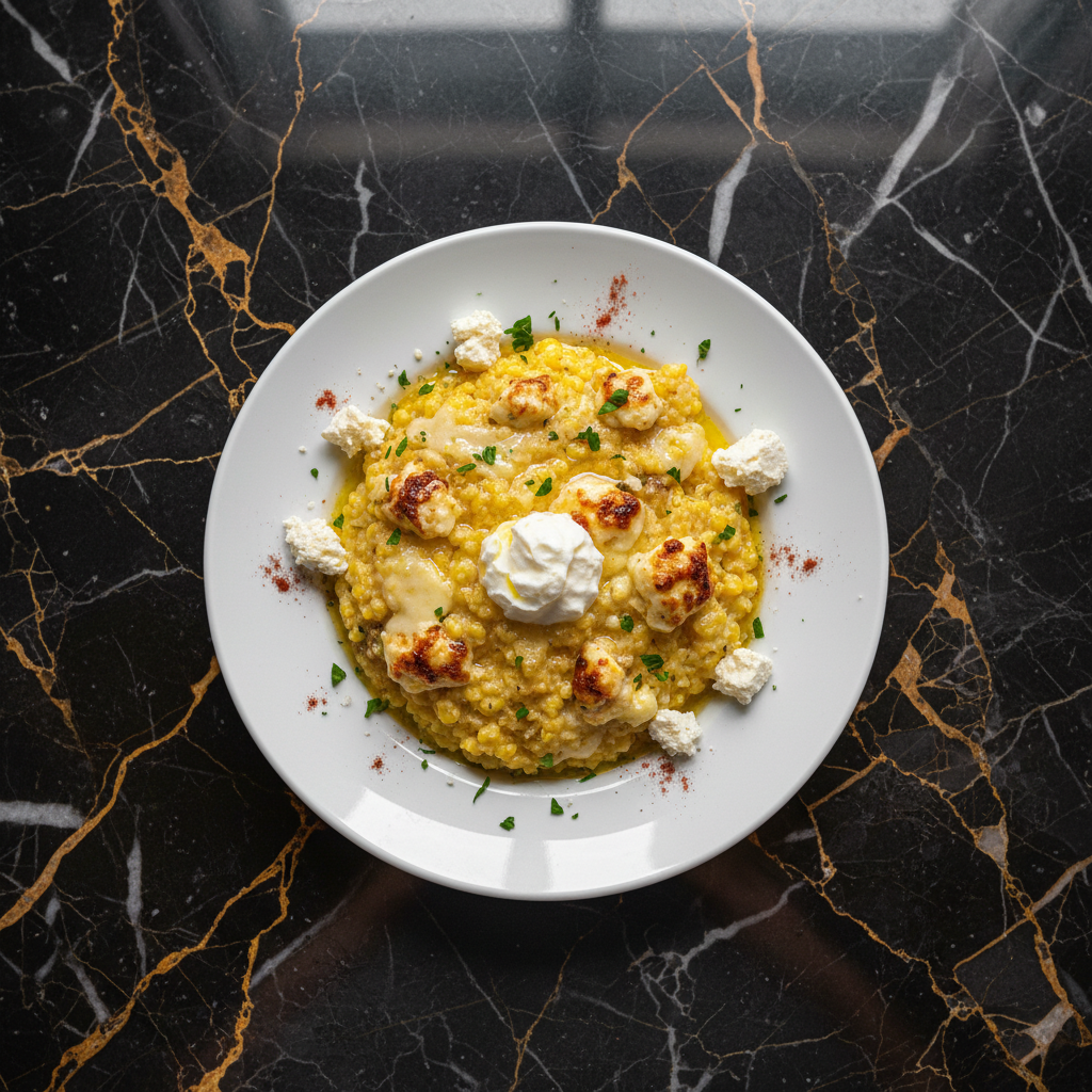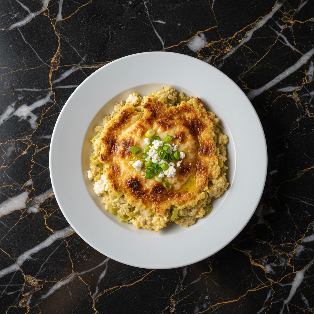 A hearty and comforting casserole from the Korรงa region of Albania, featuring a creamy blend of cornmeal, leeks, and local cheese, baked to golden perfection.