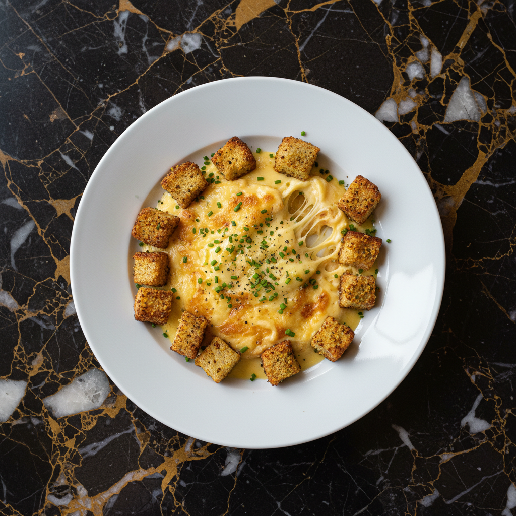 A unique Luxembourgish cooked cheese fondue, known for its stringy and gloopy texture, served with crispy, mustard-coated croutons. This dish is a delightful and comforting experience.