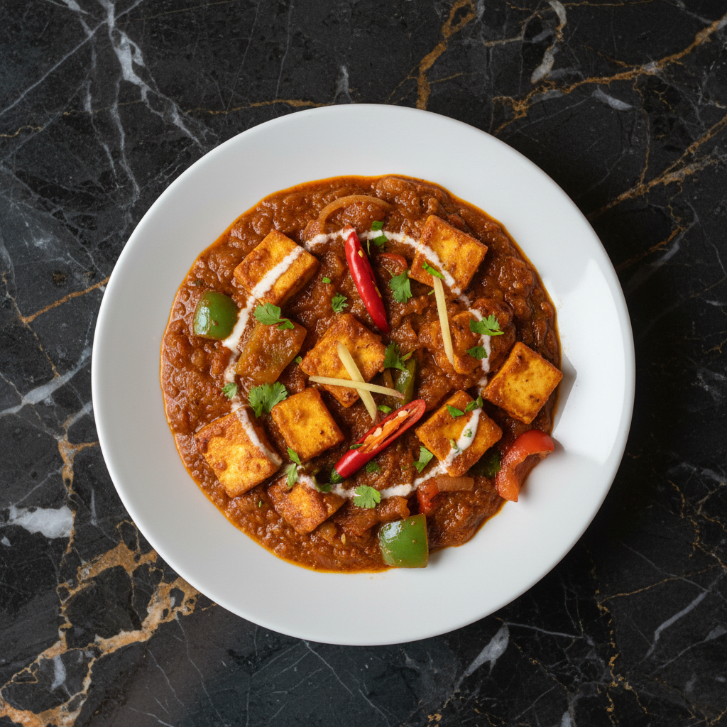 A popular North Indian dish featuring paneer (Indian cottage cheese) and bell peppers stir-fried in a rich, spicy tomato-based gravy, traditionally cooked in a kadai (Indian wok). This recipe offers a restaurant-style flavor with a delightful blend of spices.