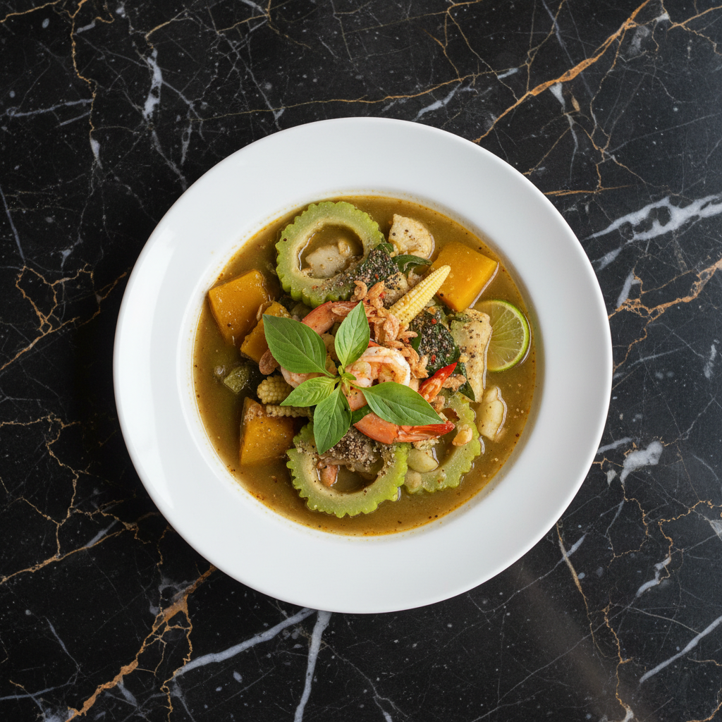 A light and peppery Thai vegetable soup, known for its nourishing properties and often consumed by new mothers to promote lactation. This soup is packed with a variety of fresh vegetables and features a fragrant paste of dried shrimp, shallots, and spices.