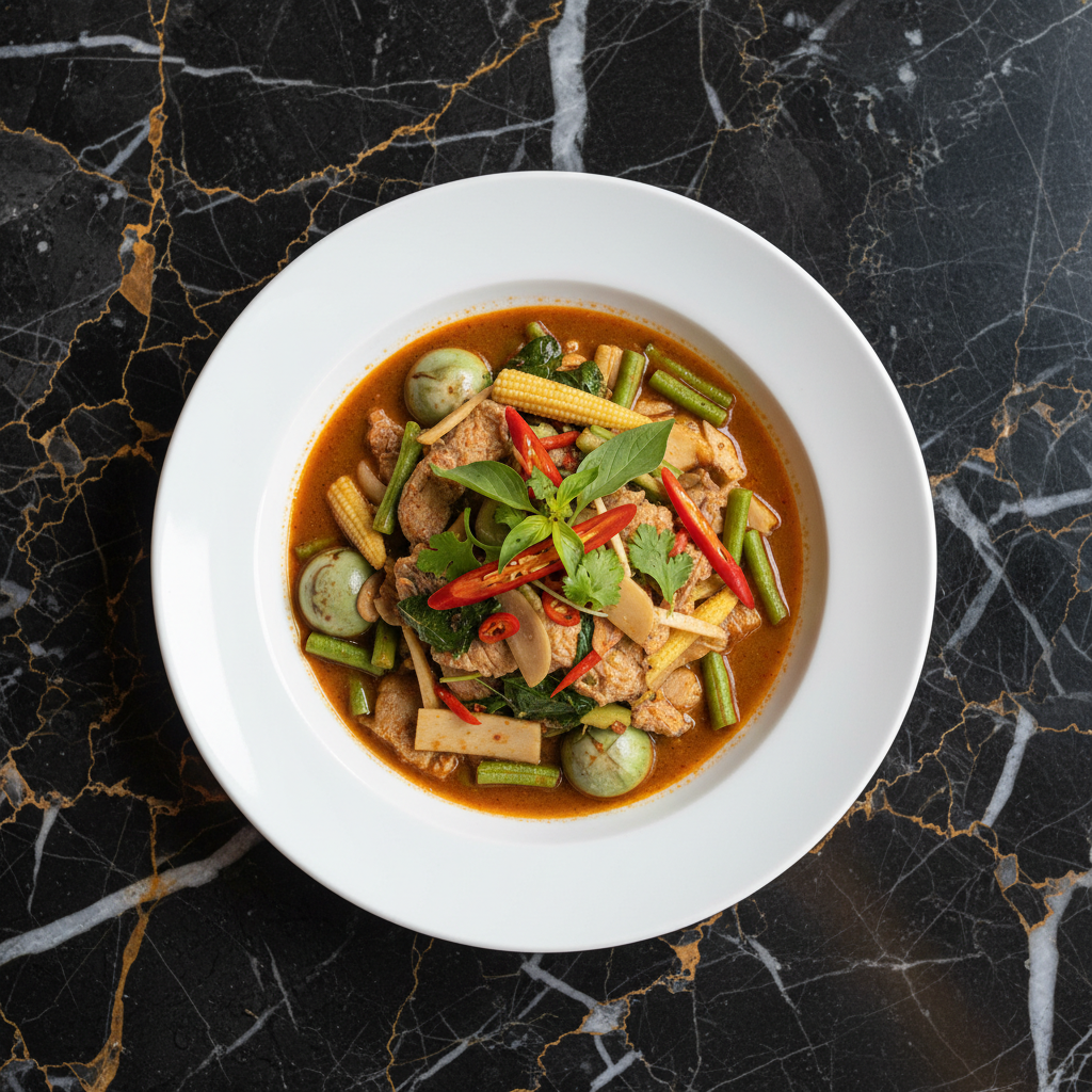An intensely flavorful and spicy Thai curry from the jungle regions, traditionally made without coconut milk. This dish is known for its bold, aromatic, and fiery profile, featuring a medley of fresh vegetables and herbs.
