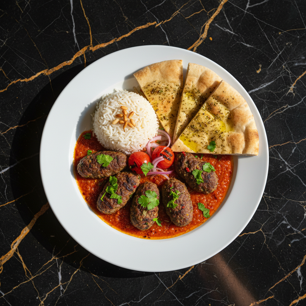 Flavorful ground meat patties (kafta), typically made with lamb or beef, simmered in a rich, spiced tomato sauce. A comforting and classic Palestinian dish often served with rice or bread.