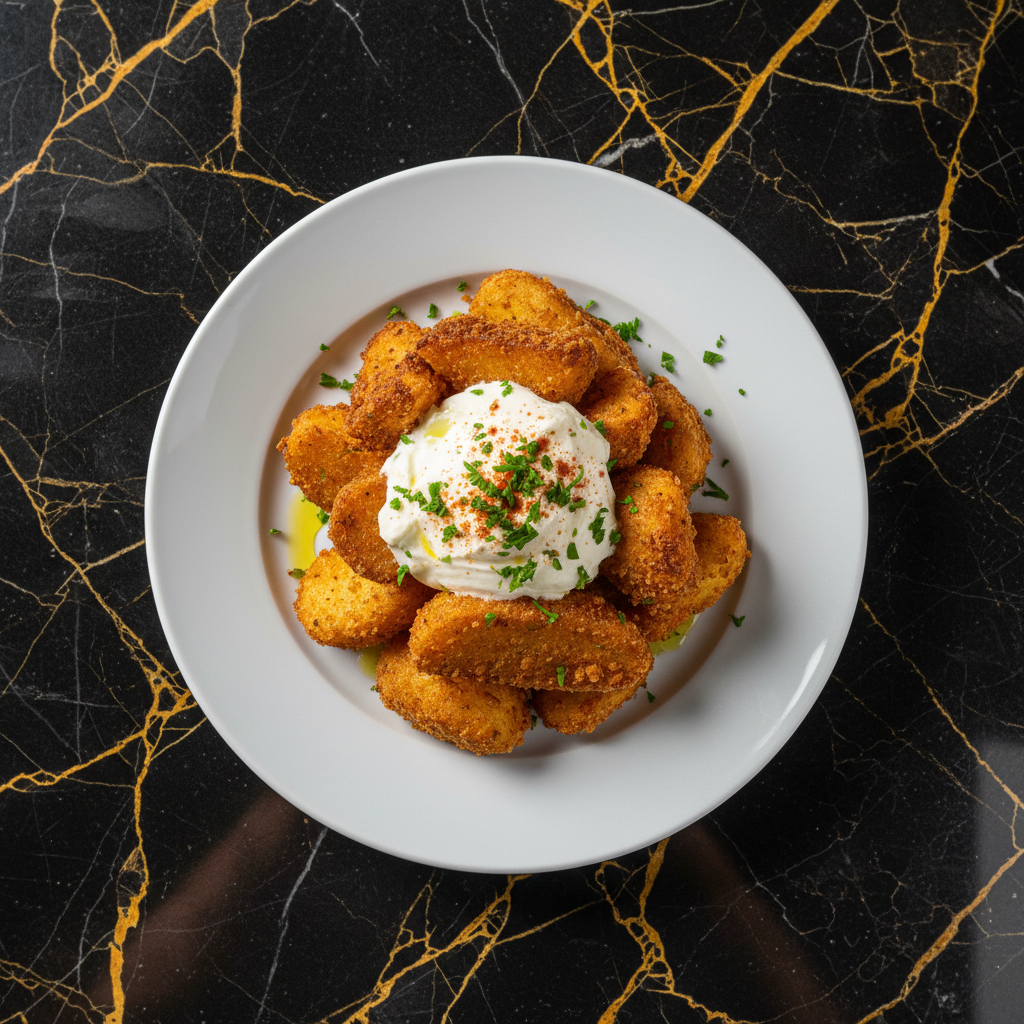 A comforting and indulgent dish featuring thick-cut potatoes, fried to a golden crisp, and served with a generous dollop of rich, creamy kajmak. It's a popular side dish or a light meal.