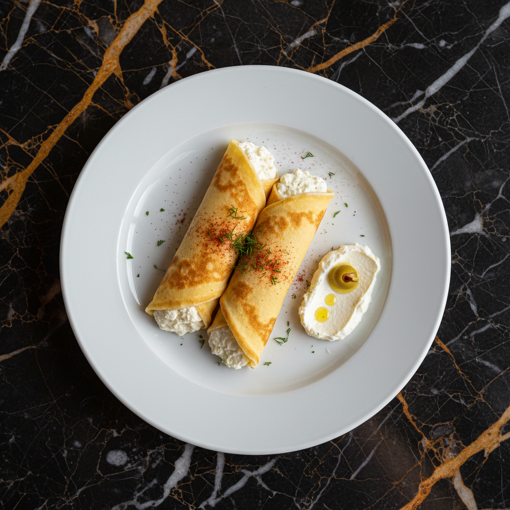 Thin Serbian-style crepes filled with a rich and creamy kajmak (clotted cream) filling, often served as a savory appetizer or light meal.