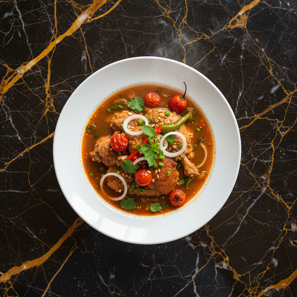 A vibrant and aromatic turkey soup, originating from the Q'eqchi' Maya people. Its distinctive reddish-orange broth comes from achiote and a blend of roasted spices and chilies.