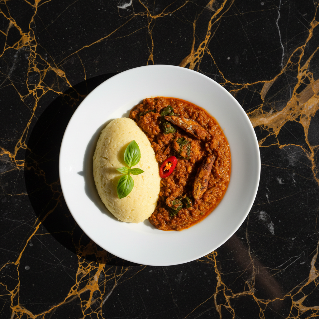 A staple dish featuring 'fufu' (a pounded dough made from cassava or plantain) served with a rich and savory sauce made from ground egusi (melon seeds), vegetables, and often meat or fish. This version uses plantain for a slightly sweeter fufu.