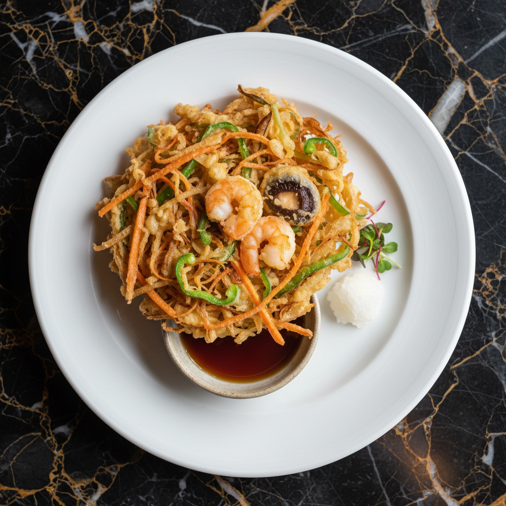 A delightful Japanese mixed vegetable and shrimp tempura fritter, characterized by its crispy, disk-like shape. It's a versatile dish that can be enjoyed on its own or as a topping for noodles or rice.