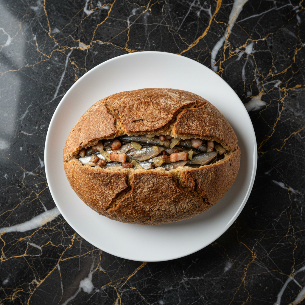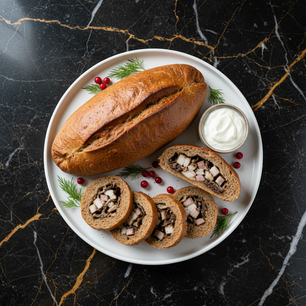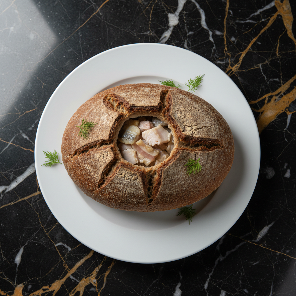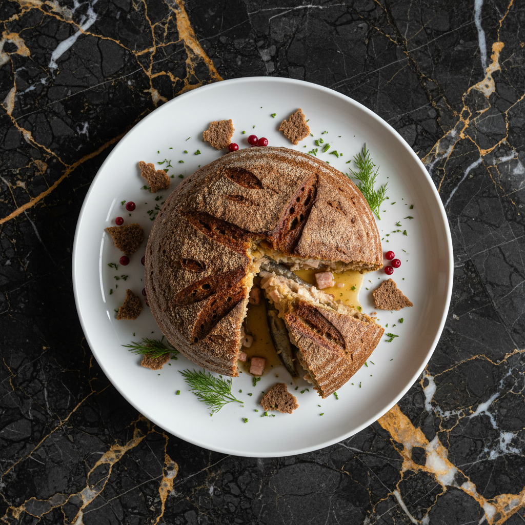 A traditional Finnish dish, particularly from the Savonia region, consisting of a loaf of rye bread filled with fish (usually vendace or perch) and pork fat. It's baked for a long time, resulting in a dense, savory pie.