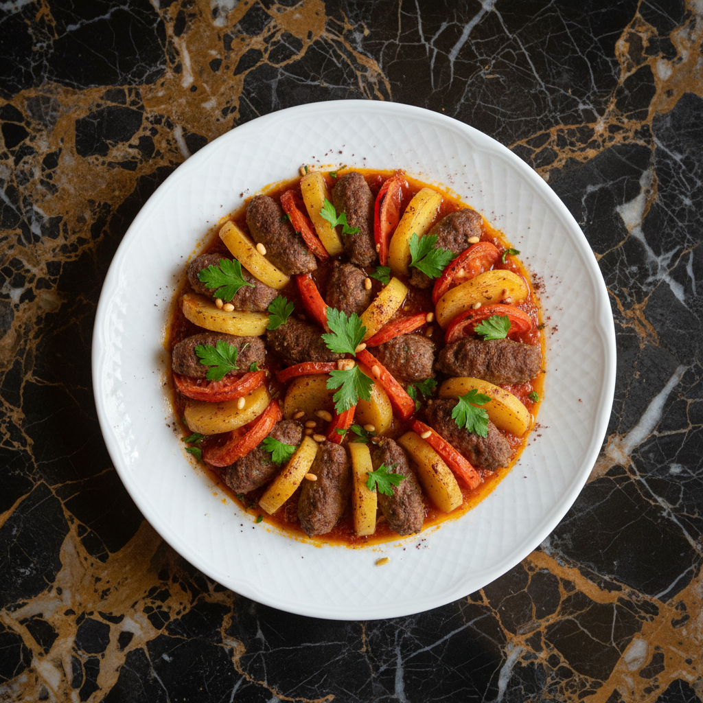 A comforting and flavorful one-pan Lebanese dish featuring seasoned ground meat (kafta) baked with layers of thinly sliced potatoes and tomatoes. This 'sayniyeh' (meaning 'on a tray') is a classic home-cooked meal, perfect for a weeknight dinner or a gathering.