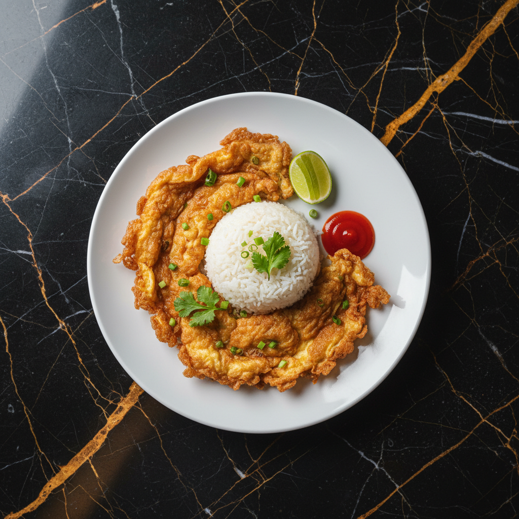 A simple yet incredibly satisfying Thai home-style omelet, known for its crispy edges and fluffy interior. It's traditionally deep-fried until puffed and golden, then served immediately over steamed rice with a side of Sriracha for a quick and flavorful meal.