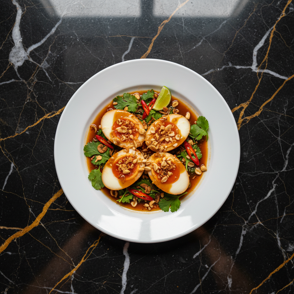 Kai Look Koey, literally translating to 'eggs looking at the son-in-law', are a classic Thai dish featuring perfectly fried hard-boiled eggs coated in a sweet, sour, and savory tamarind sauce. The eggs are deep-fried until their whites blister and puff up, creating a delightful texture contrast with the rich sauce. This dish is a perfect appetizer or side, offering a complex flavor profile that is both addictive and intriguing.