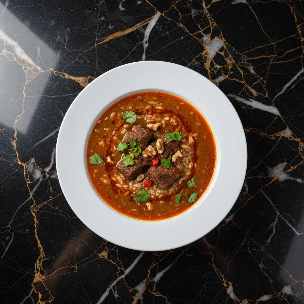 A rich and hearty Georgian soup made with tender beef, rice, walnuts, and a flavorful broth seasoned with tklapi (sour plum paste) and spices.