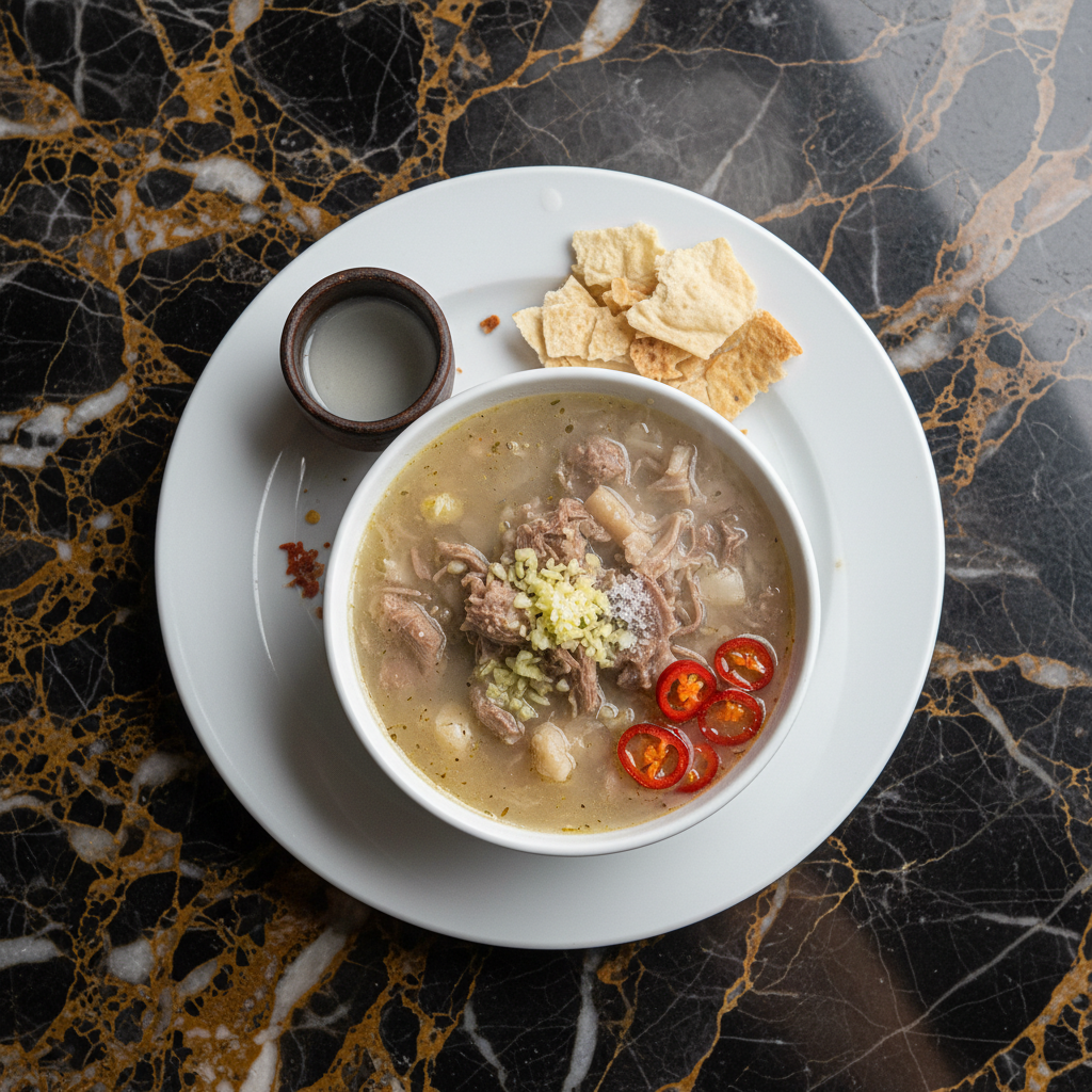 Khashi is a traditional Georgian soup renowned for its restorative properties, particularly as a hangover cure. Made from beef (or sometimes lamb) head, feet, and tripe, it's simmered for hours until the meat is incredibly tender and the broth is rich and gelatinous. It's typically seasoned generously with garlic and salt, and served piping hot with lavash bread and chacha (a Georgian spirit).