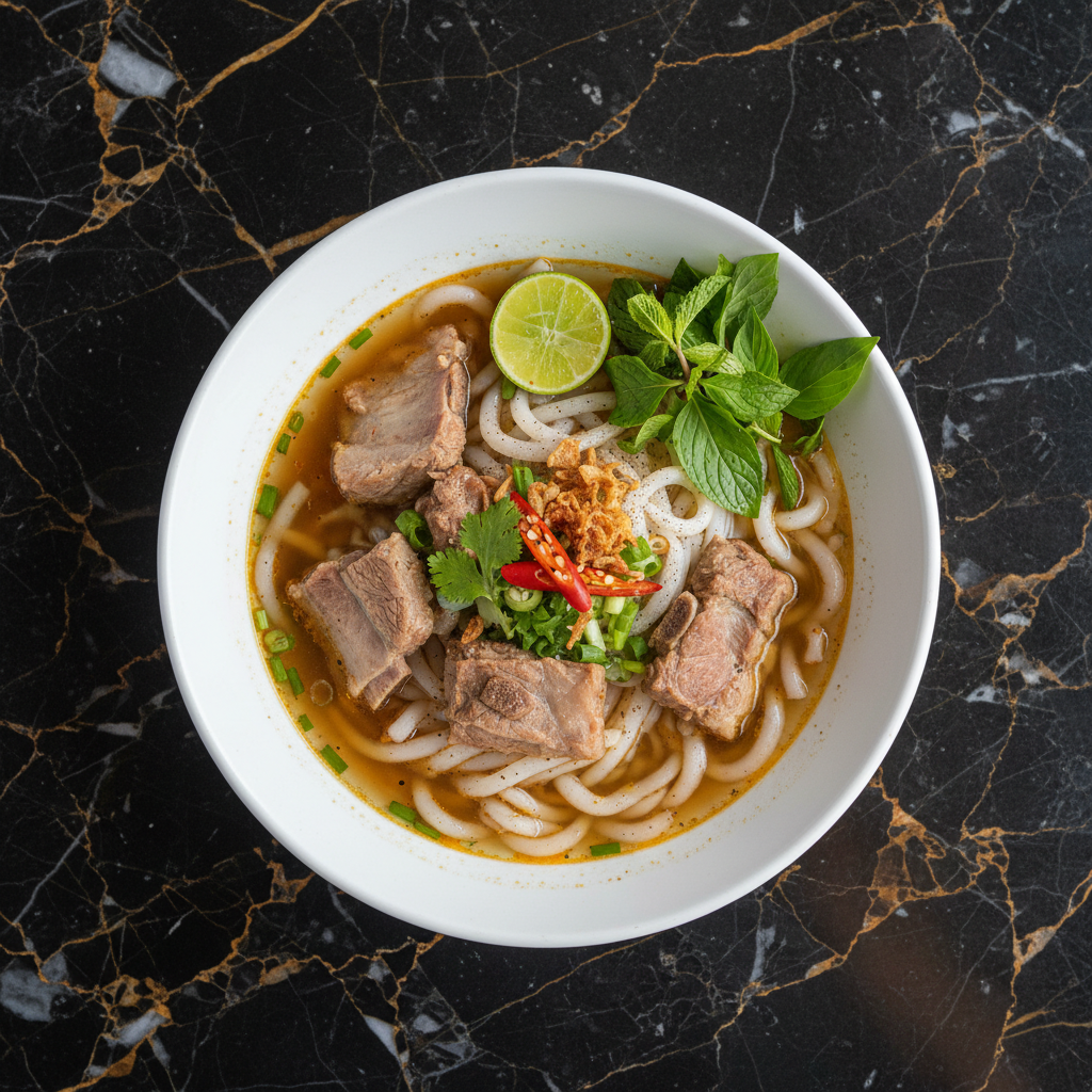 A comforting and hearty noodle soup featuring tender pork ribs simmered in a savory broth, served with thick rice noodles and a variety of fresh herbs and garnishes. It's a popular breakfast or anytime meal in Laos.