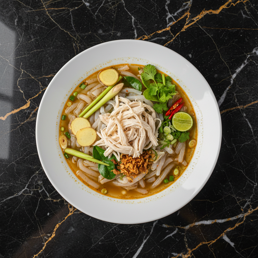 A beloved Northern Thai dish, Khao Soi is a rich and fragrant coconut curry noodle soup. It features tender chicken simmered in a spiced coconut broth, served with soft egg noodles and topped with a delightful tangle of crispy fried noodles, fresh lime, pickled mustard greens, and thinly sliced shallots.