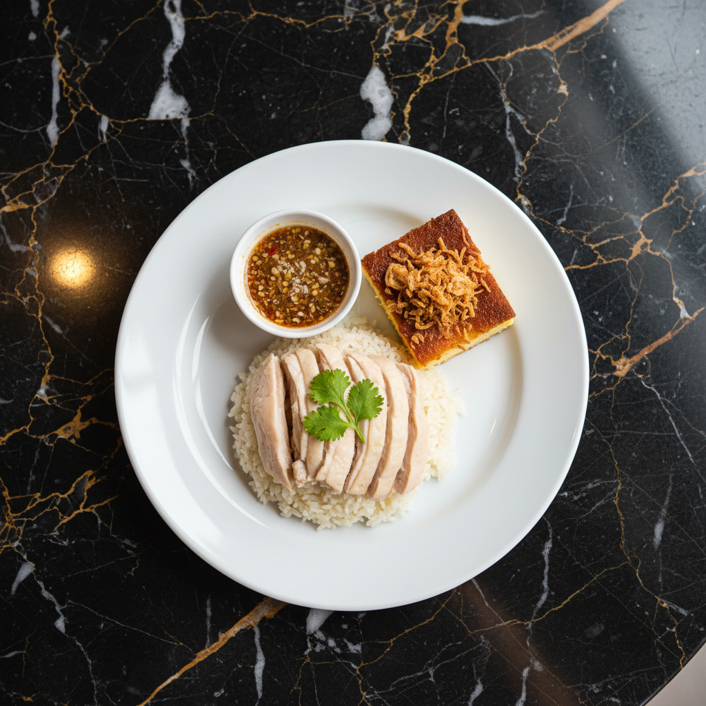 A beloved Thai comfort food, Khao Man Gai features tender, poached chicken served over fragrant rice cooked in chicken broth and fat, accompanied by a flavorful ginger-soy dipping sauce. It's a Thai adaptation of the Hainanese chicken rice dish.