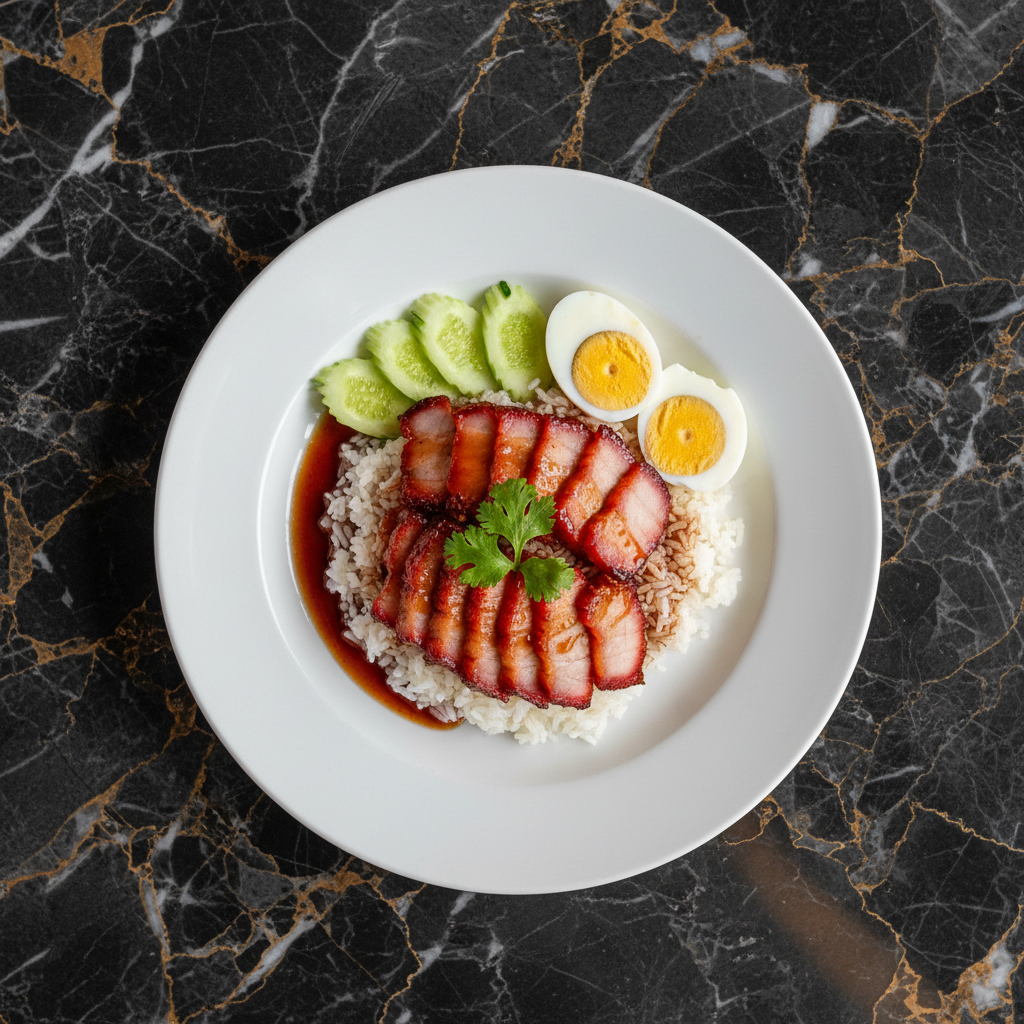 A beloved Chinese-Thai staple, Khao Moo Daeng features succulent, tender pork shoulder marinated in a sweet and savory red sauce, then roasted to a beautiful char. It's typically served sliced over steamed rice, accompanied by Chinese sausage, a hard-boiled egg, and a generous drizzle of the rich, sweet gravy.