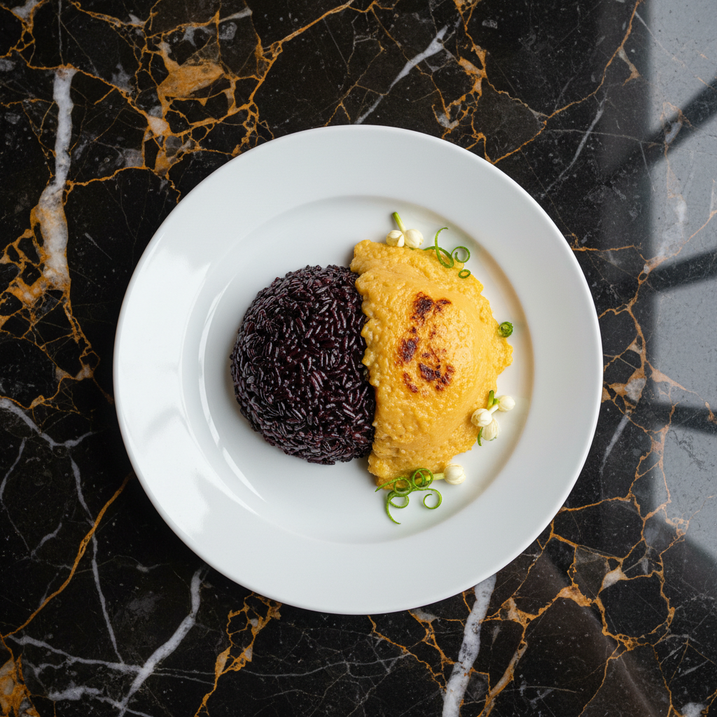 An elegant and traditional Thai dessert featuring chewy, fragrant black glutinous rice topped with a rich, silky coconut-egg custard. The deep purple hue of the rice contrasts beautifully with the golden custard.