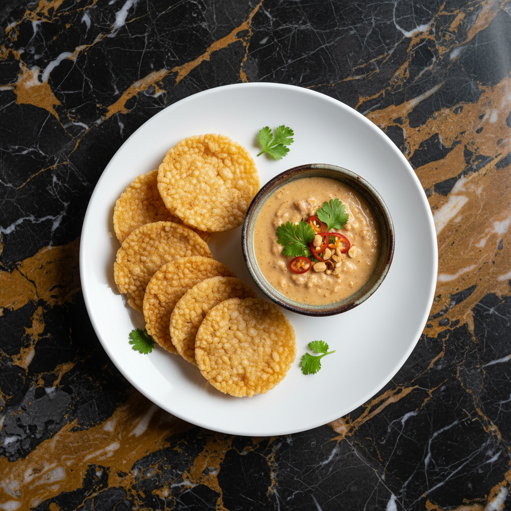 A classic Thai royal appetizer featuring crispy, puffed rice crackers served with a rich, savory-sweet coconut milk and pork dip. This dish offers a delightful contrast in textures and a complex flavor profile.