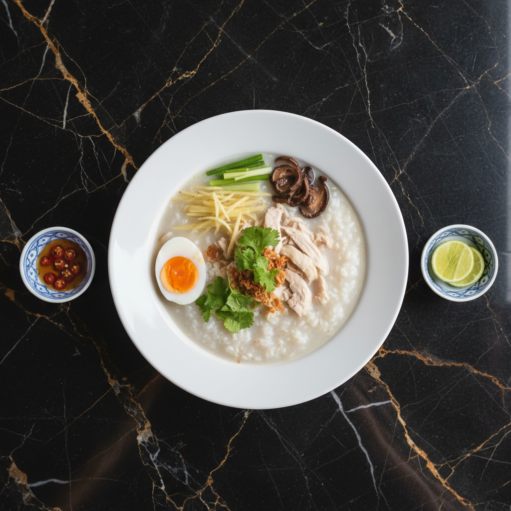 A comforting and simple Thai rice porridge, often enjoyed for breakfast. This version features tender ground pork and aromatic ginger, finished with crispy fried garlic and a hint of white pepper.