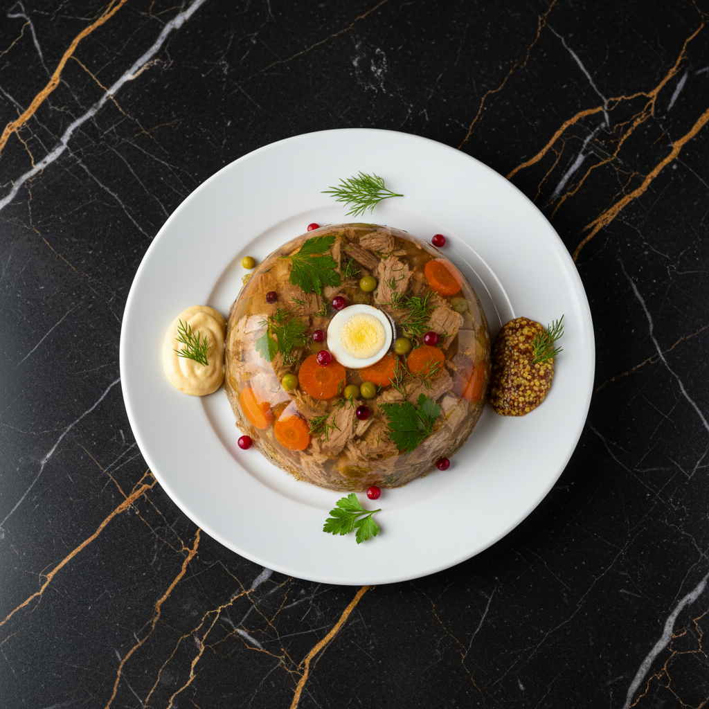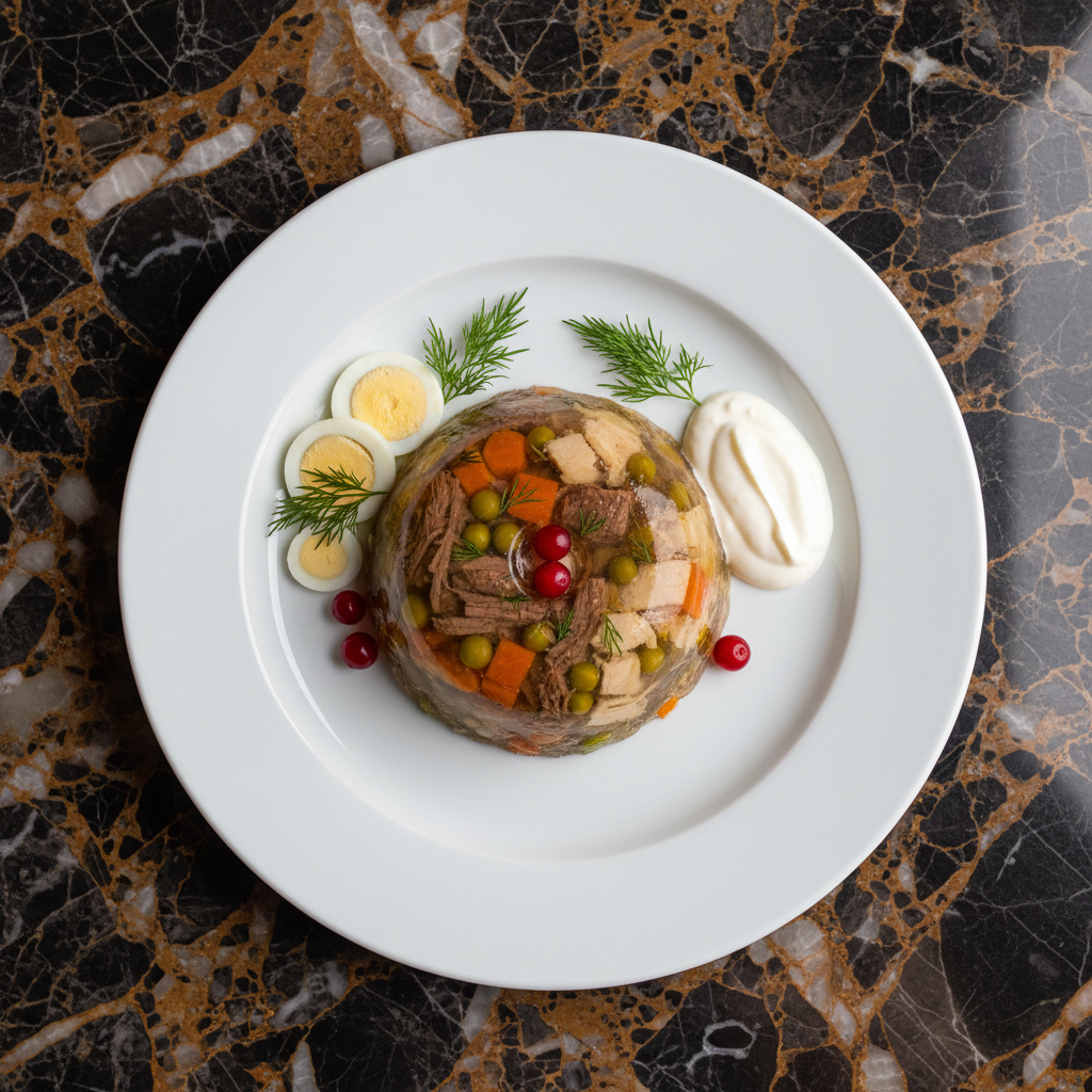 A traditional Belarusian meat aspic, often made with pork or beef, slow-cooked to extract gelatin for a firm, savory jelly. It's typically served cold with horseradish or mustard.