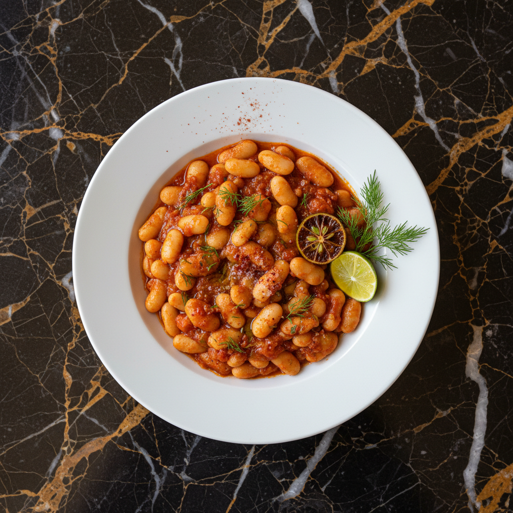 A comforting and hearty Persian home-style stew featuring tender white beans simmered in a rich tomato and turmeric sauce, infused with the aromatic essence of dill. This dish is a staple in Iranian households, often served as a side or a light main course with rice.
