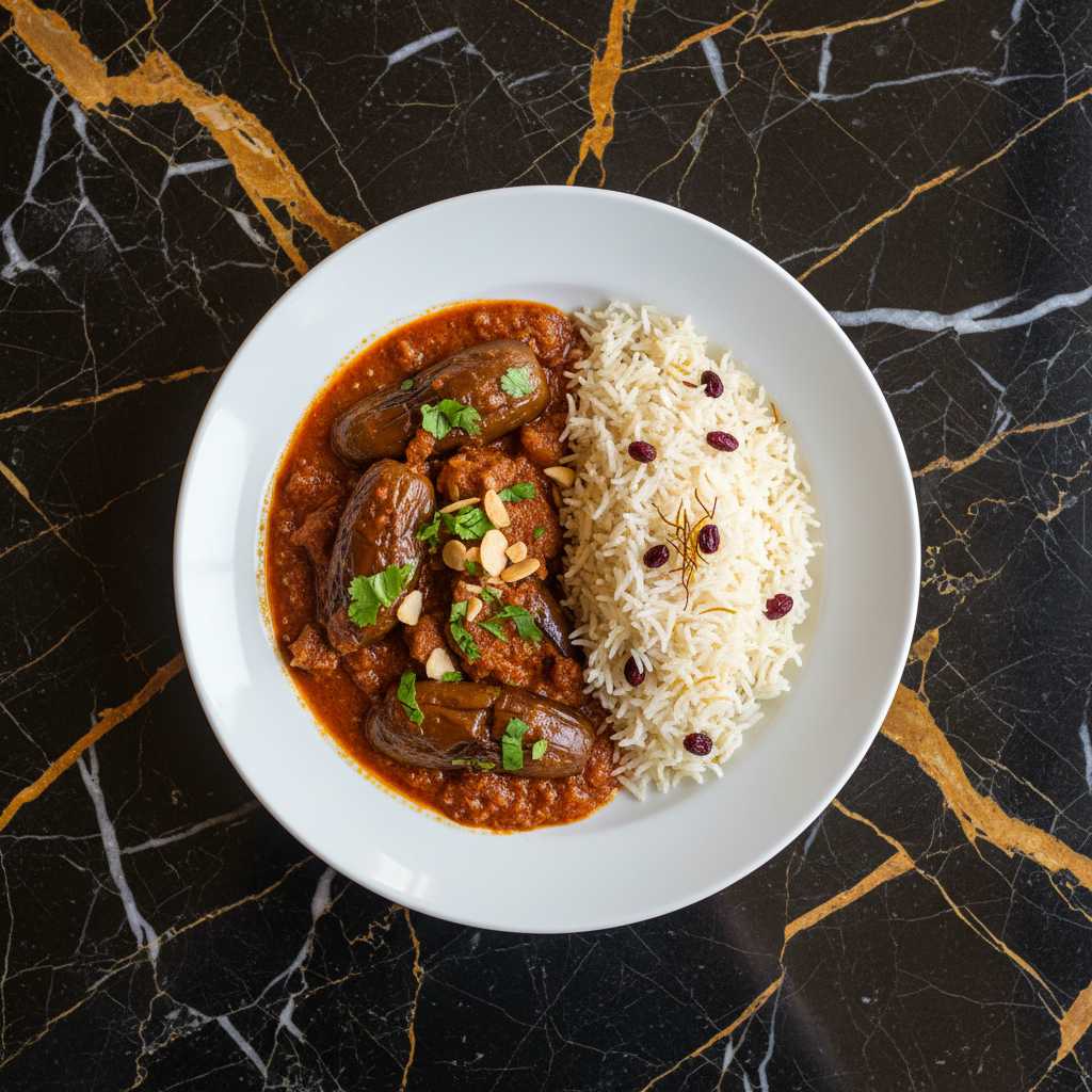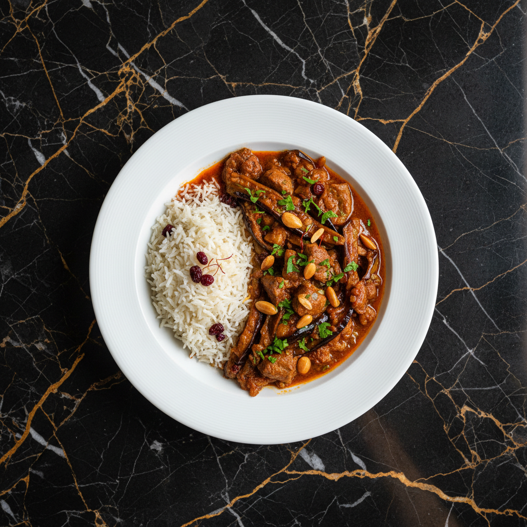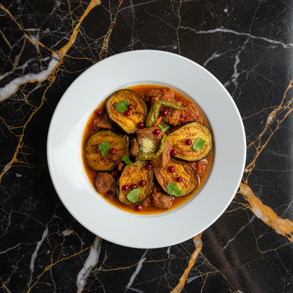 A rich and flavorful stew featuring tender lamb and tender eggplant, simmered in a tomato-based sauce with aromatic spices. This dish is a comforting and hearty meal, often served with rice.