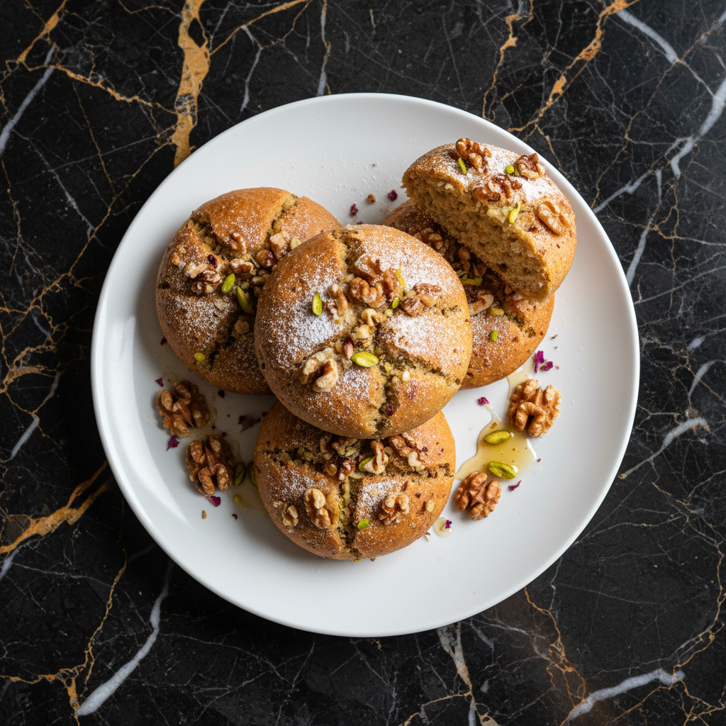Khibz bil Joz is a subtly sweet and fragrant bread, often made for special occasions or holidays in Syria. It features a soft, enriched dough studded with chopped nuts, typically walnuts, and flavored with rose water or orange blossom water.