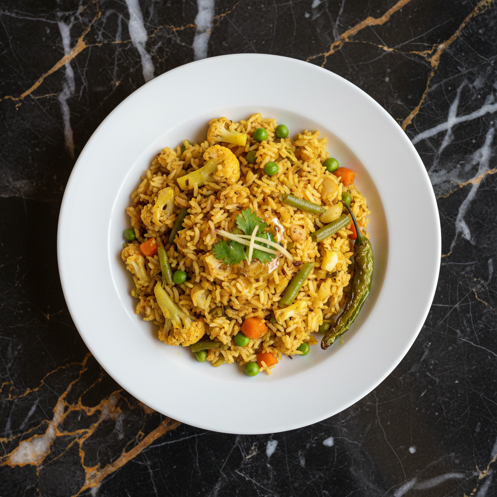 A comforting and wholesome one-pot meal made with rice, lentils, and an assortment of seasonal vegetables, seasoned with aromatic spices. It's a staple comfort food, often enjoyed during rainy days or as a light meal.