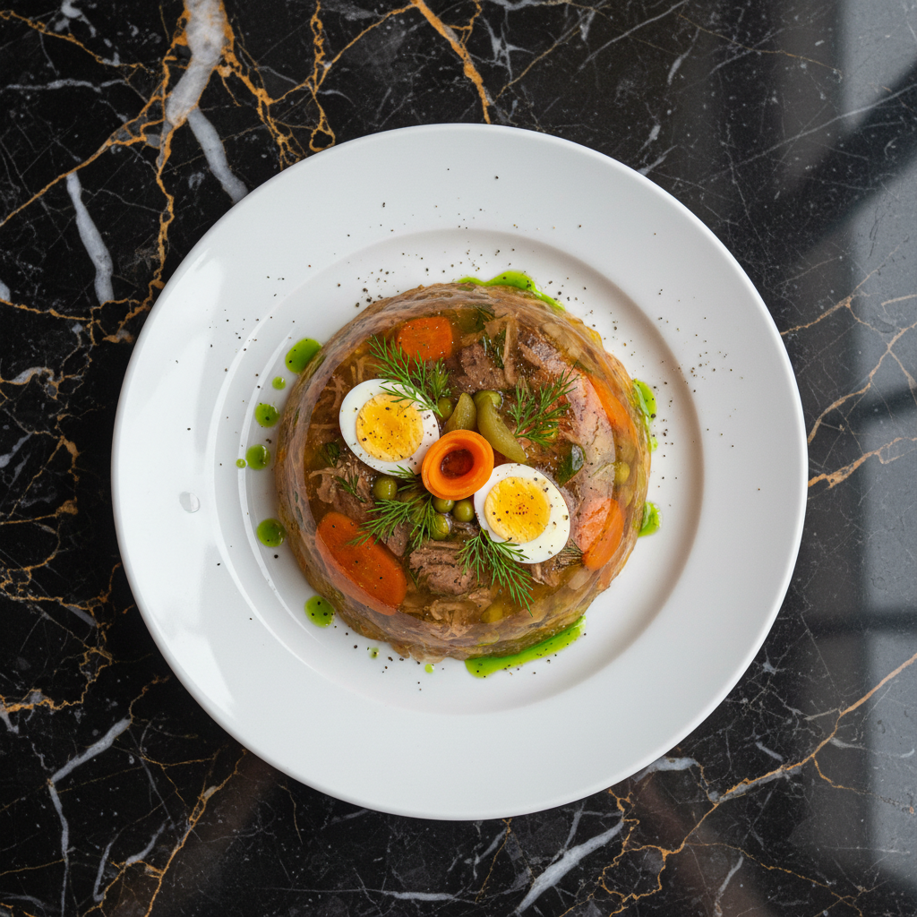 A savory meat jelly or aspic, Kholodets is a festive dish often prepared for holidays and special occasions. It's made by slow-cooking meat and bones to extract gelatin, then chilling it until set.