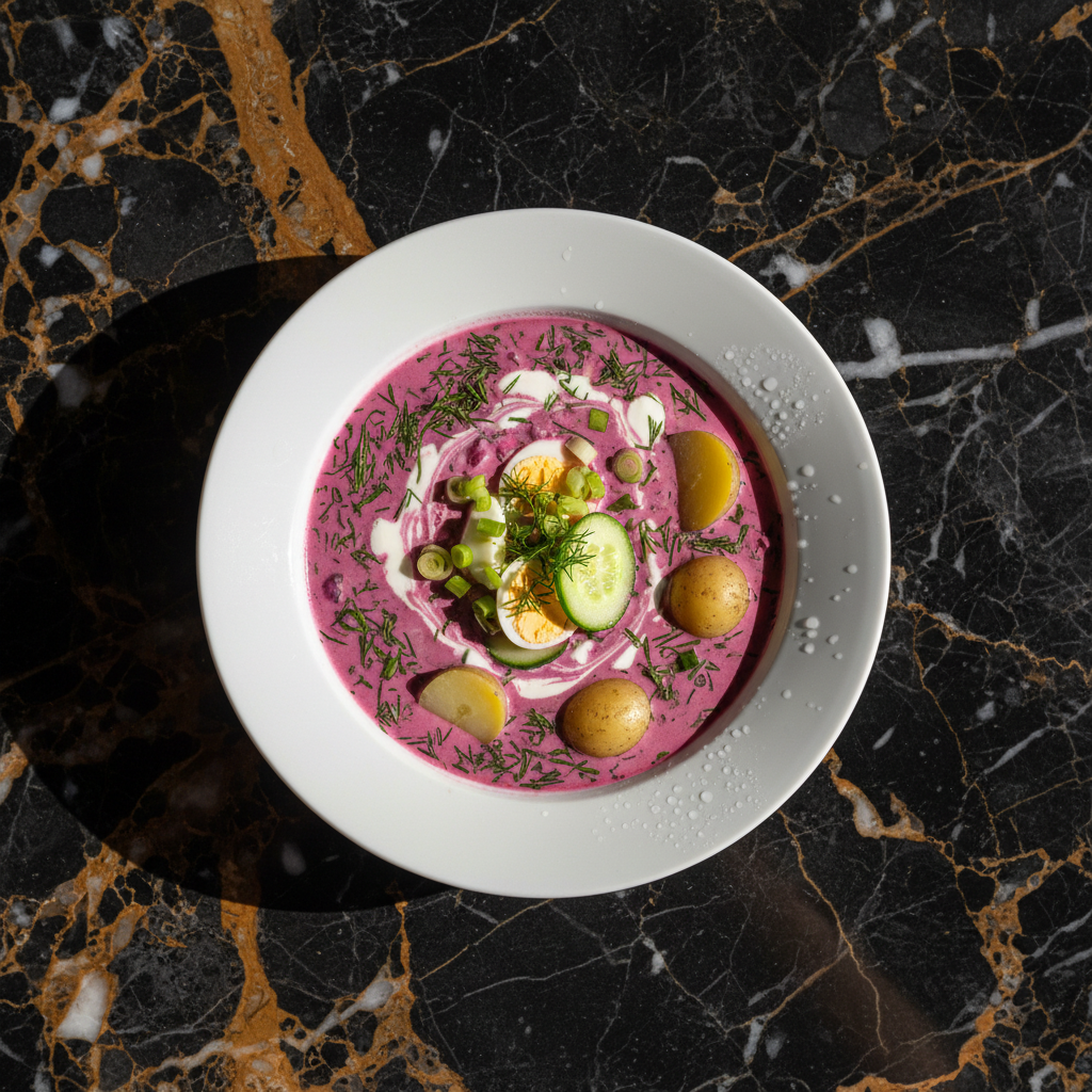 A refreshing and vibrant cold soup made from boiled beetroots, mixed with kefir or buttermilk, and enhanced with fresh vegetables like cucumbers, dill, and spring onions. This Kholodnik is a perfect summer dish, offering a delightful balance of earthy sweetness and tangy notes, often served with hard-boiled eggs and boiled potatoes.