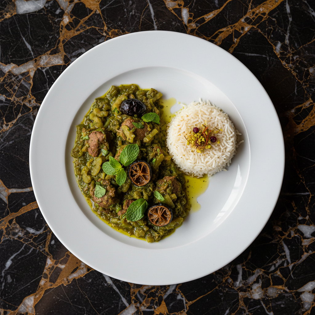 A rich and comforting Persian stew featuring tender lamb, sweet fried eggplant, and a savory tomato base, enhanced with the bright tang of sour grape juice. A true classic for any table.