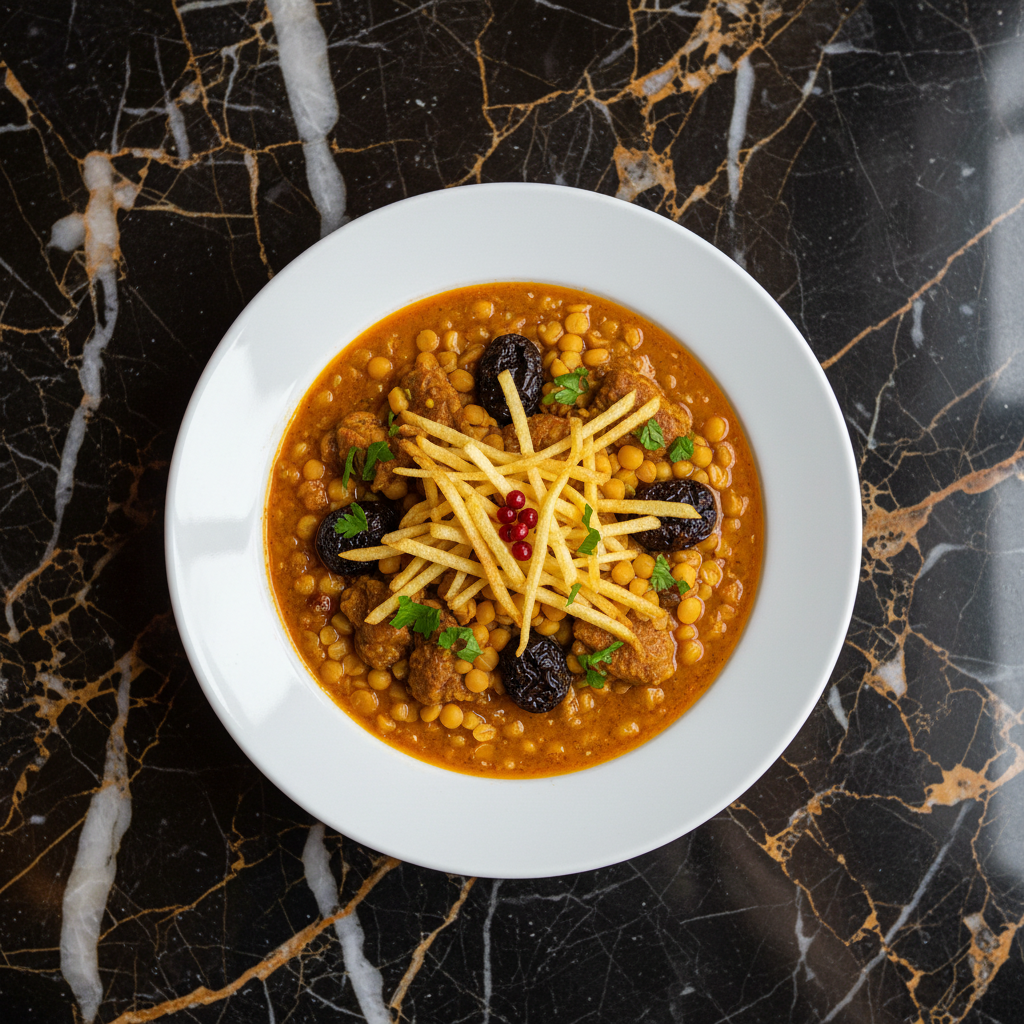 A classic and comforting Persian stew featuring tender lamb, yellow split peas, and the unique tangy flavor of dried limes, traditionally served with rice and topped with crispy shoestring fries.