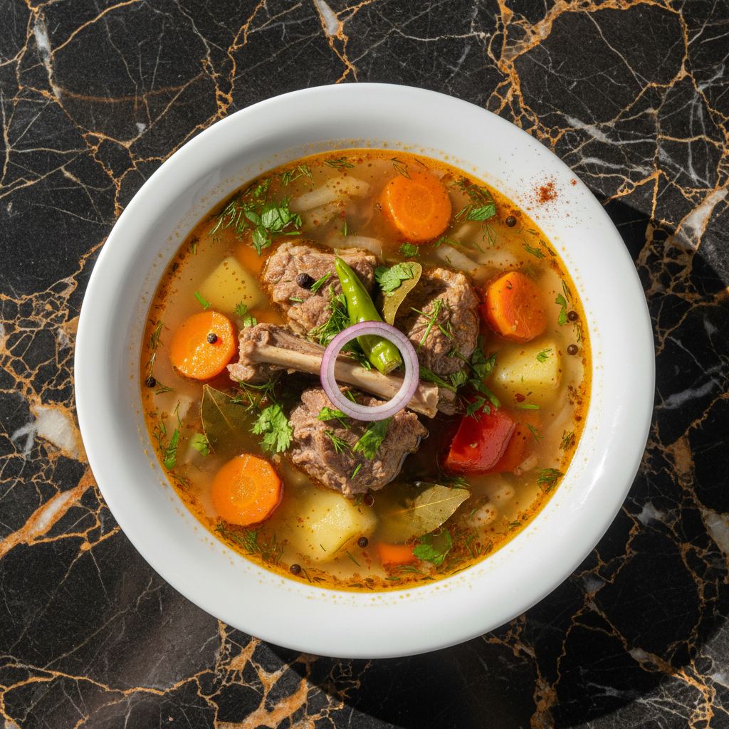 A fragrant and deeply flavorful lamb soup originating from the Khorezm region, characterized by its rich broth, tender lamb, and a generous amount of fresh herbs and vegetables. This shurpa is lighter than some other Uzbek soups but packed with aromatic spices.
